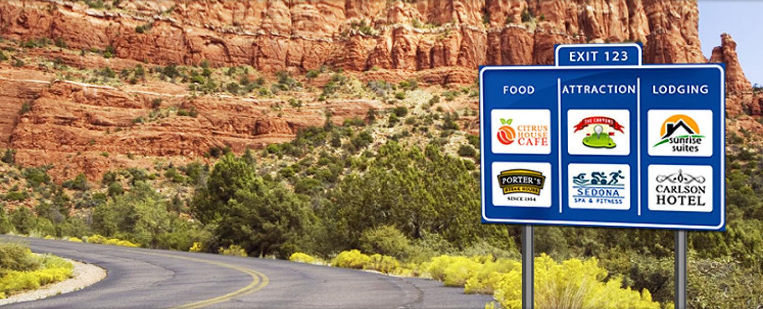 The program was developed to provide important information to motorists on the availability and location of food/restaurants, lodging, gas, camping, attractions and electric vehicle (EV) charging along state highways and interstates in Arizona. This information enhances the experience of traveling motorists and provides your business an opportunity to attract those motorists at a time when they can immediately benefit from your products and services.